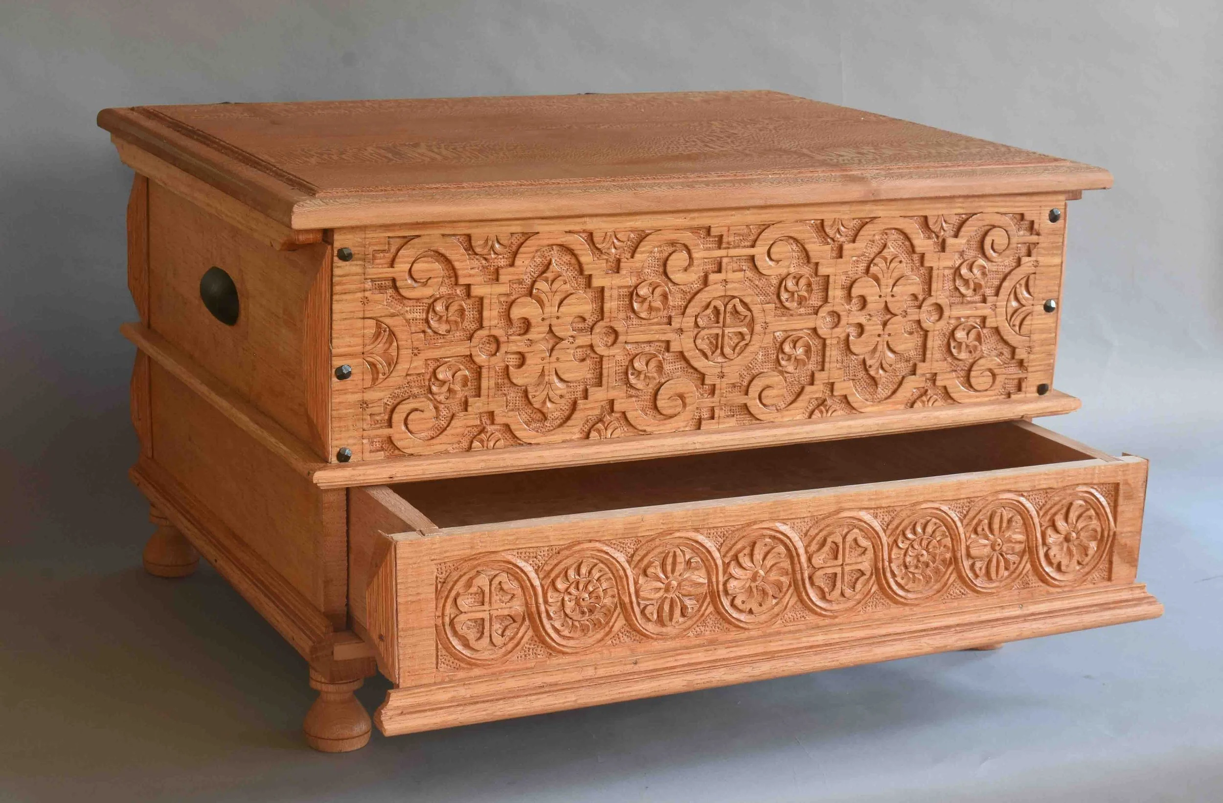 A carved box with a lidded till inside. All handmade, the box is red oak, bottom and lid white pine.