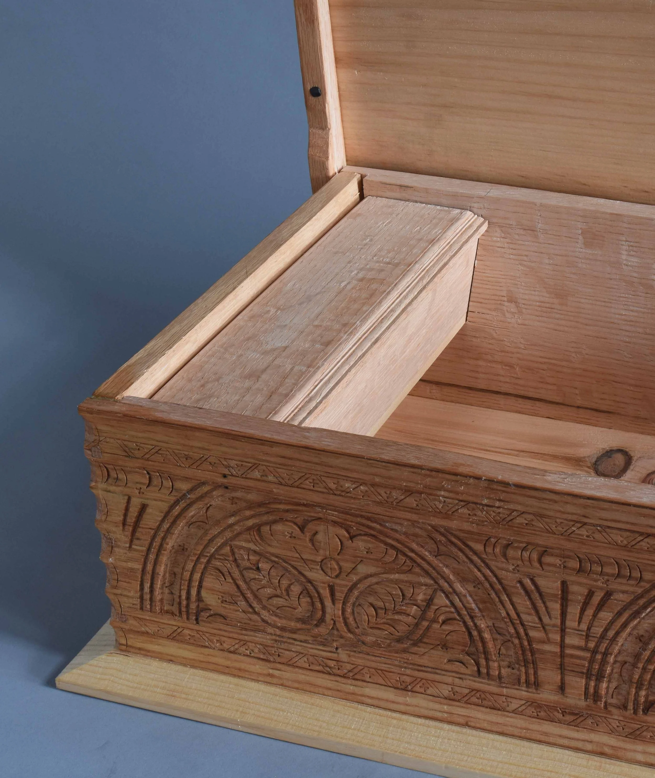 a small carved oak box, based on works from 17th-century Ipswich, Massachusetts . Oak box and lid, pine bottom.