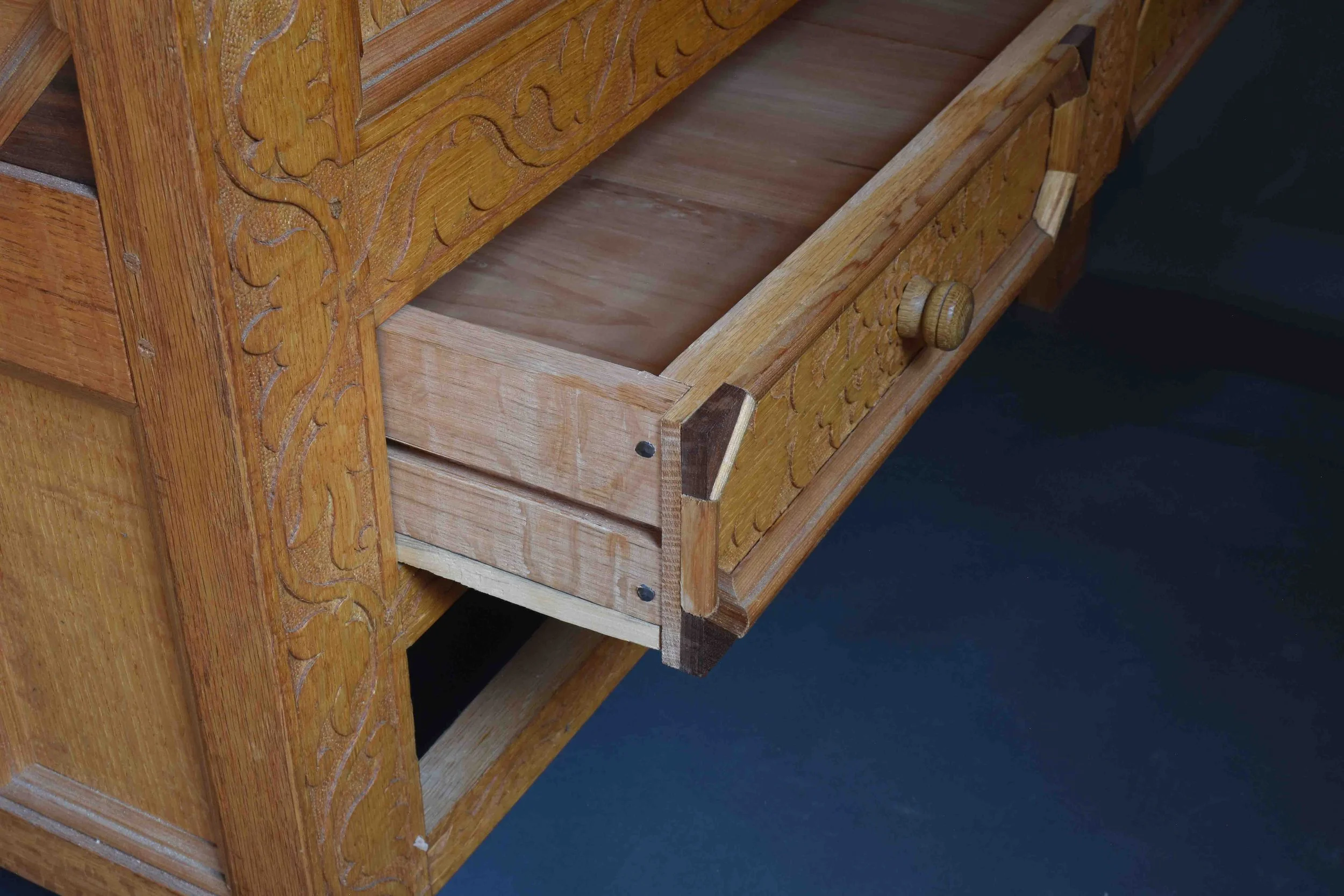 All the construction is just as the original; riven red oak, frame & panel, etc. Drawers are rabbeted and nailed. A lidded till inside.