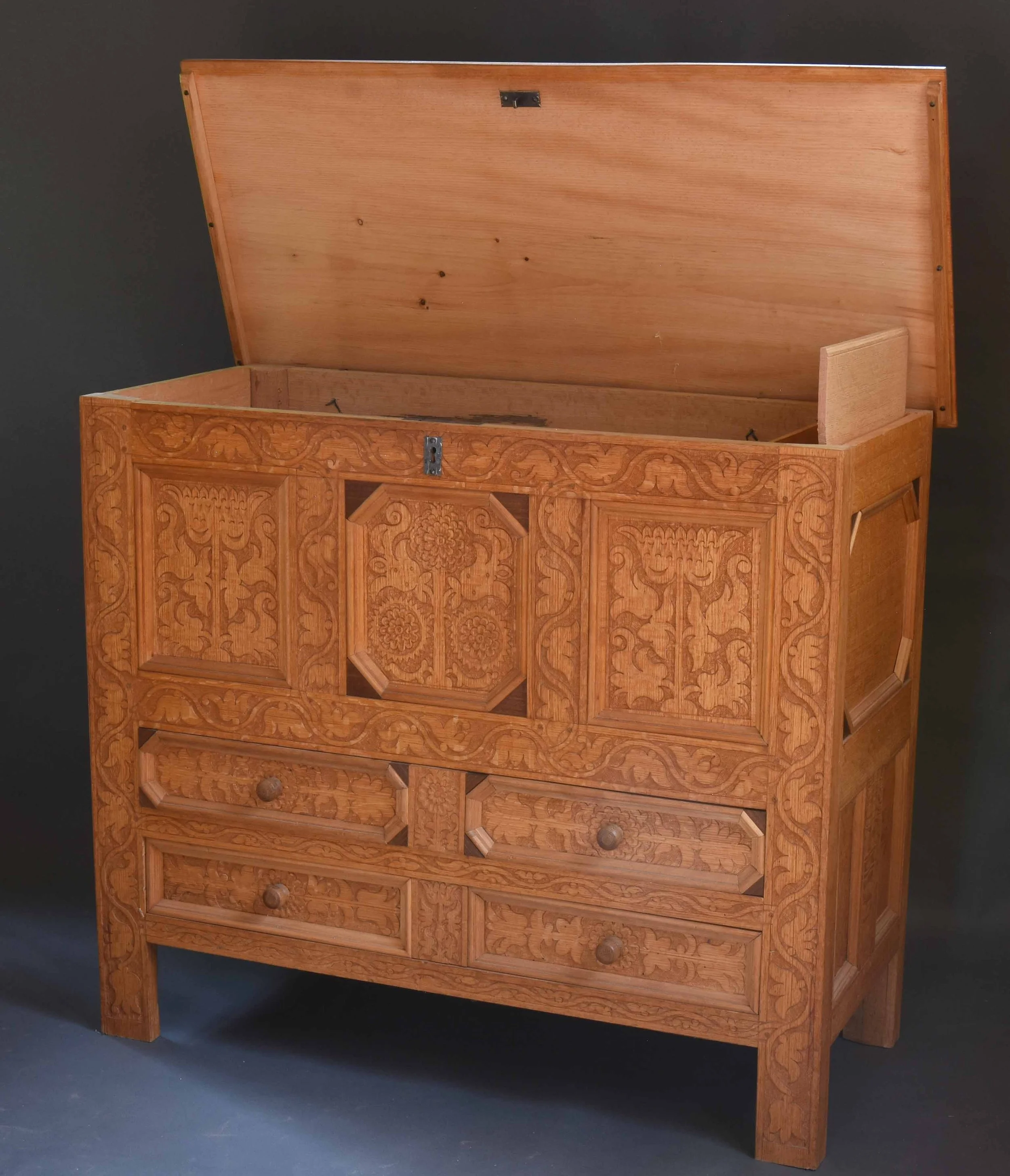 This is my fourth version of this iconic wainscot chair. It’s based on two nearly-identical period examples attributed to Thomas Dennis of Ipswich, Massachusetts. Those chairs are at the Peabody Essex Museum in Salem, Massachusetts and the Bowdoin College Museum of Art in Brunswick, Maine. Mine follows the scale and most of the details of the period chairs. I changed the panel and slightly altered the strapwork carving on the top rail.