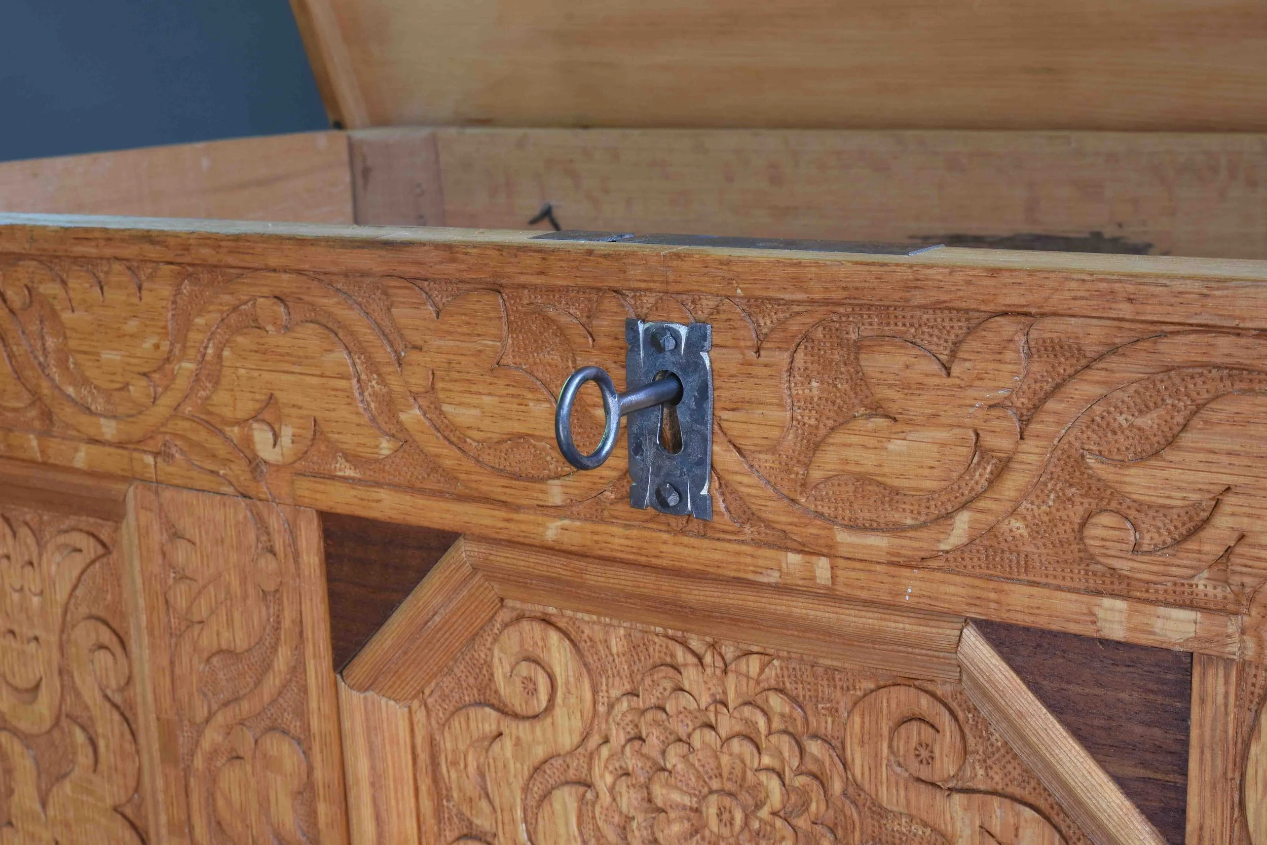 This large oak chest is based on one made in Connecticut in the 2nd half of the 17th century. It’s primarily red oak and white pine, with applied moldings around the panels of Atlantic white cedar with black walnut accent blocks. The nails, hinges & iron lock and key were made by my friend Mark Atchison, a blacksmith I’ve worked with for over 30 years.