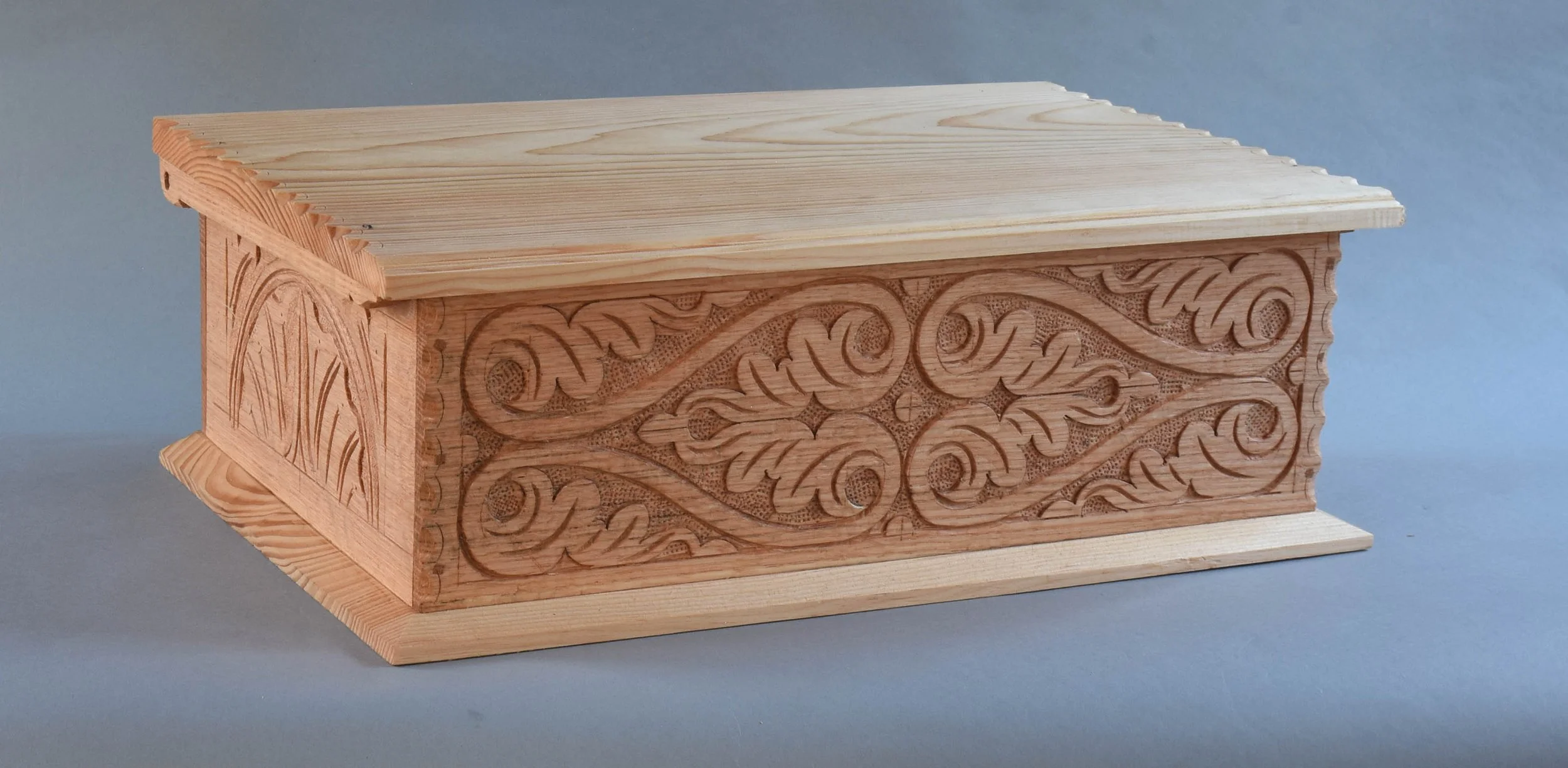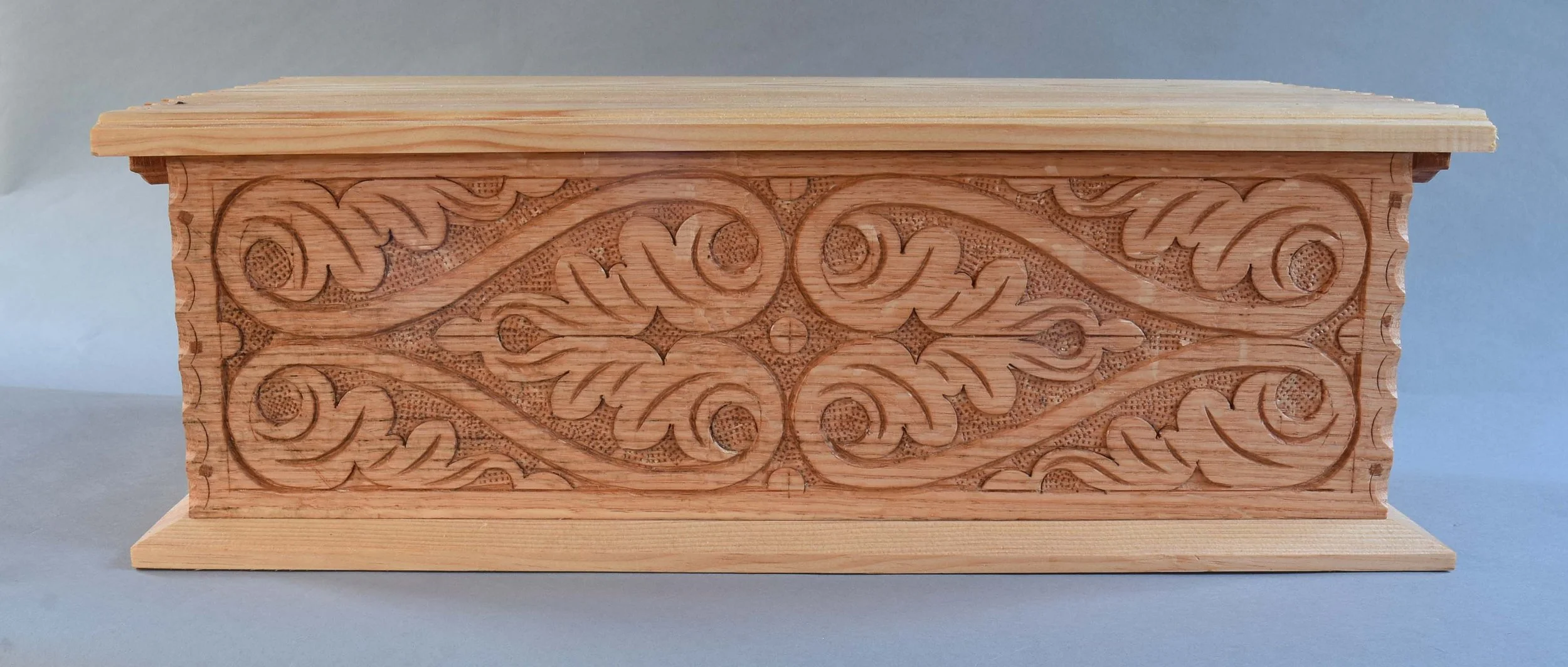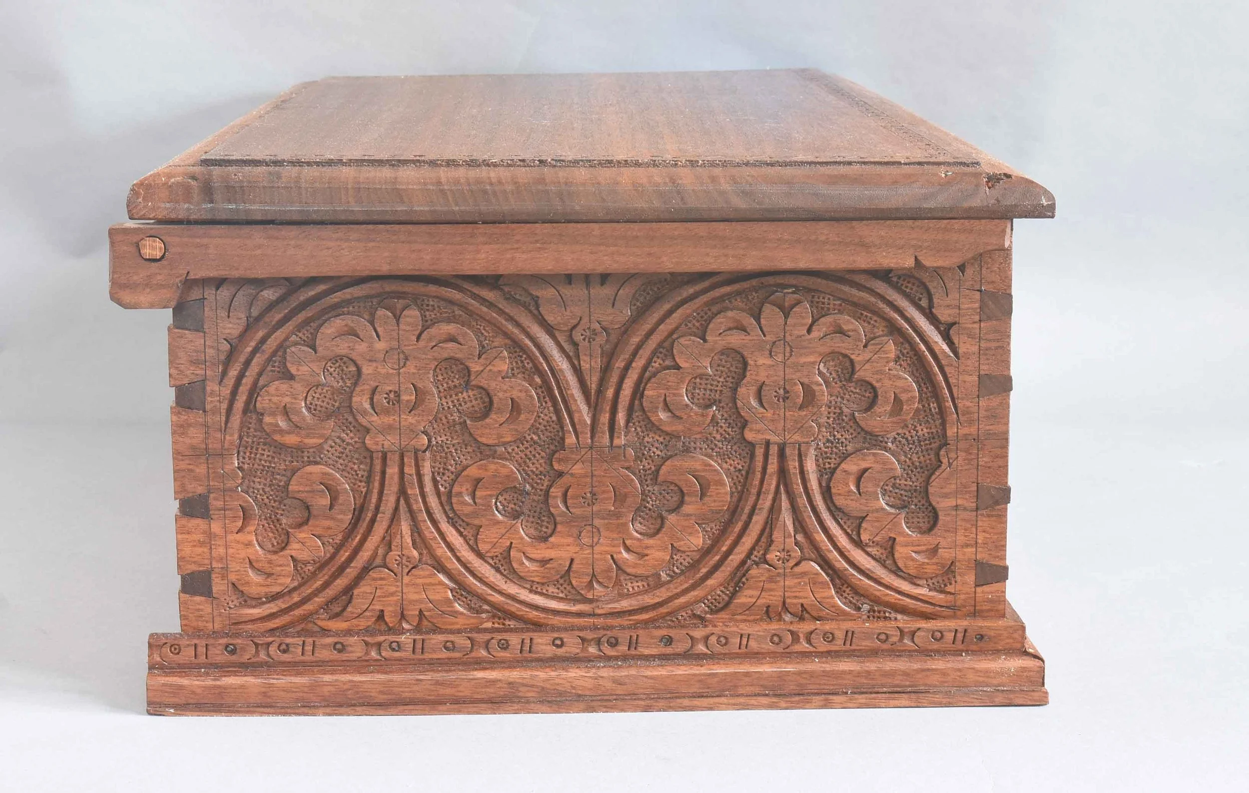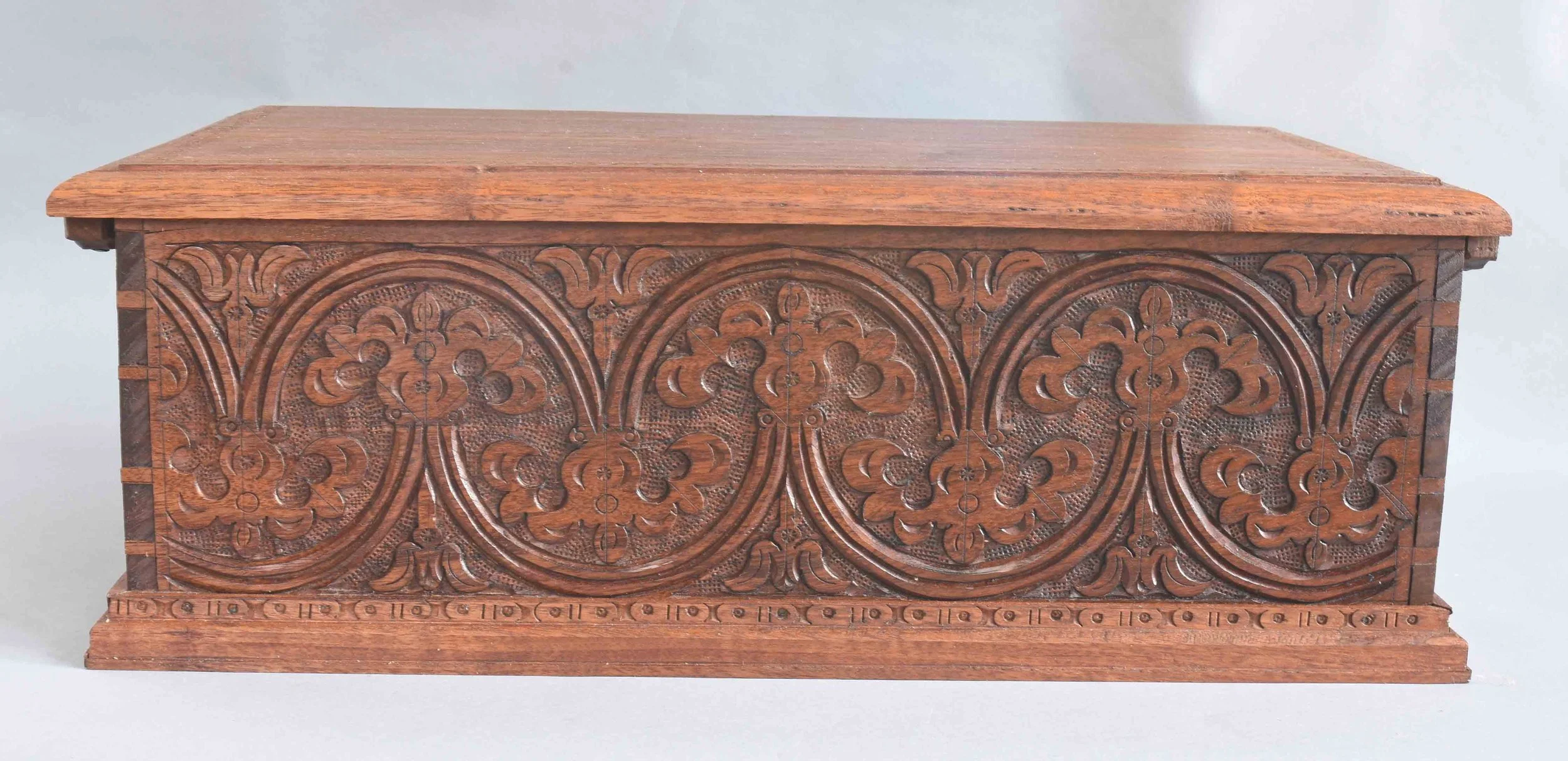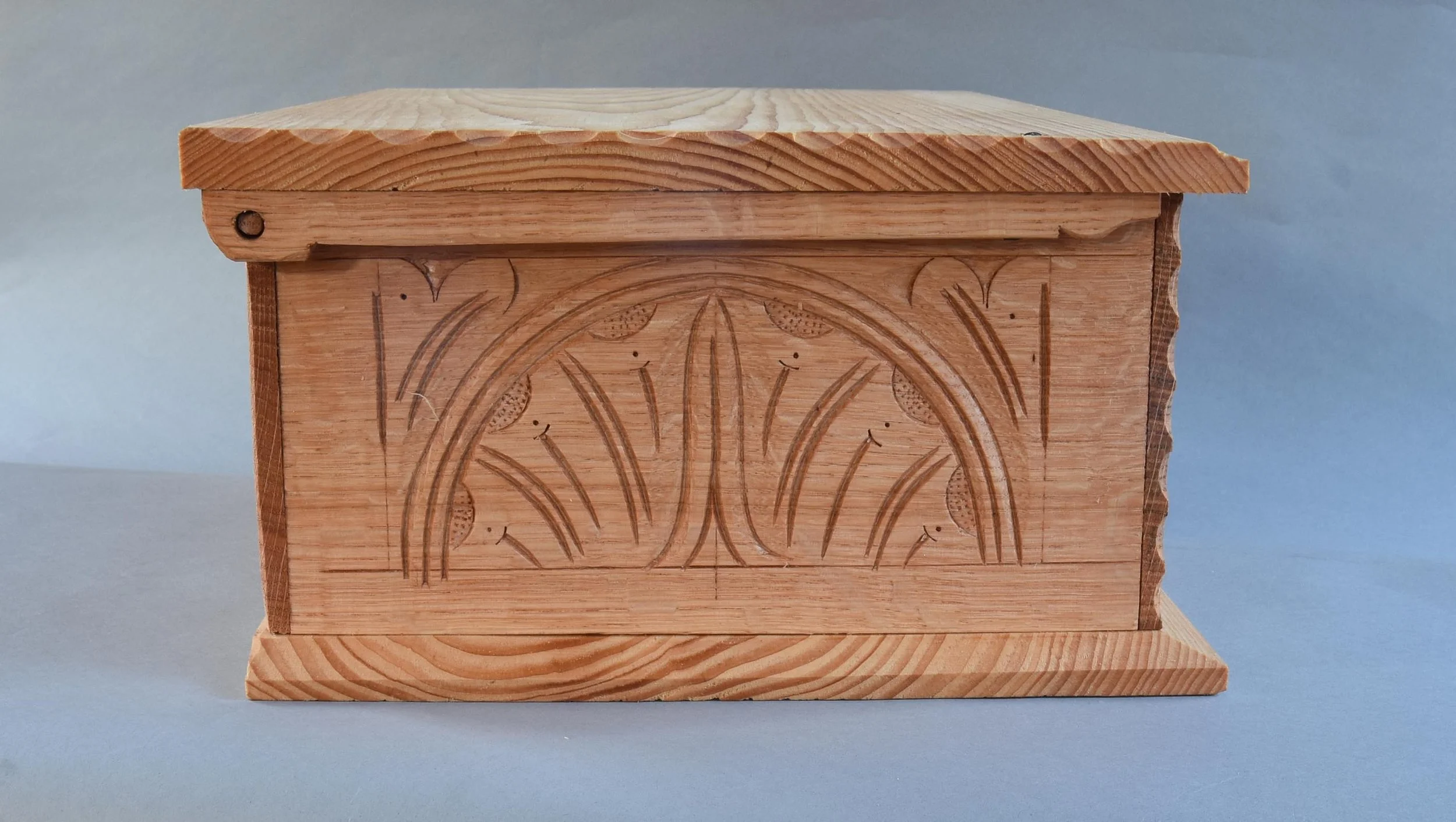 It’s a carving I’ve done several times, usually in oak. I adapted it from a box in Victor Chinnery’s Oak Furniture: the British Tradition. Being used, there’s some usual scuffs and dings here & there. I just wiped a fresh coat of linseed oil on it last week. I resisted the urge to go back & tinker with it - it’s in fine shape as it is, so I left it as it is.