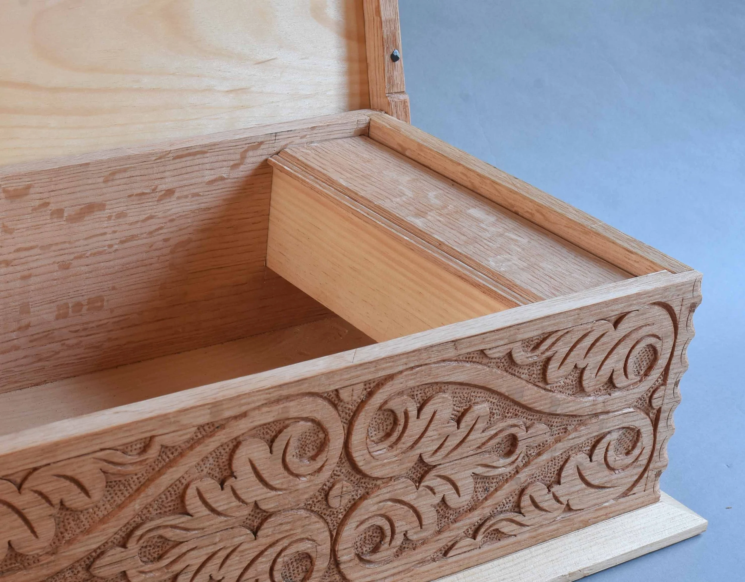 Carved box, red oak & white pine, MARCH 2026